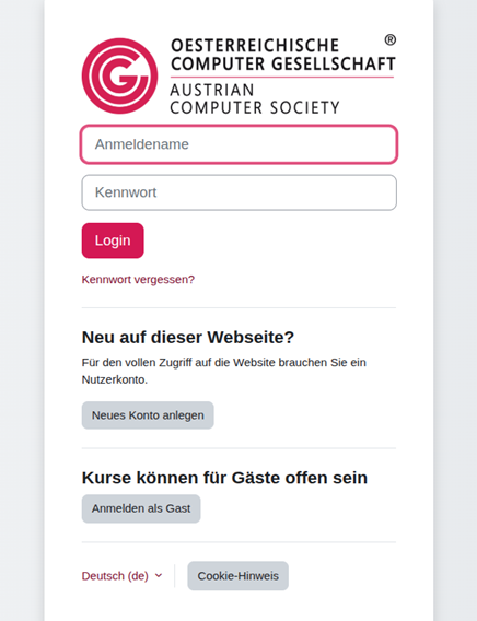 5. Login (https://learn.ocg.at/login/) mit dem erstellen Nutzerkonto (Anmeldename, Passwort)