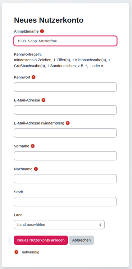 3. Pflichtfelder ausfüllen, der Anmeldename muss an den ersten 4 Stellen das Geburtsjahr sein, alle weiteren Zeichen sind frei wählbar (also z.B. 1998_Sepp_Musterfrau):